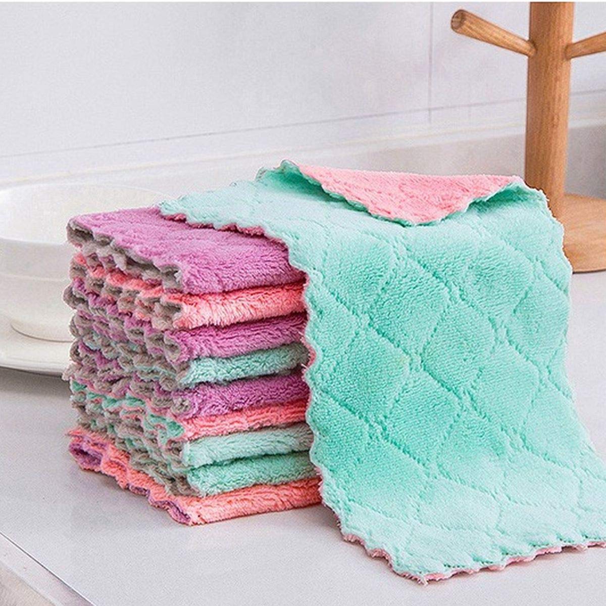 - [ULTRA ABSORBENT AND DRY QUICKLY, EASY TO CLEAN]- 12 pack multi-color absorbent kitchen towels are made of high-quality coral velvet, with a soft and non stick texture, light weight, strong water absorption, and fast drying. Classic cleaning cloths can quickly and effectively absorb liquids, wipe oil stains, and have strong decontamination capabilities.